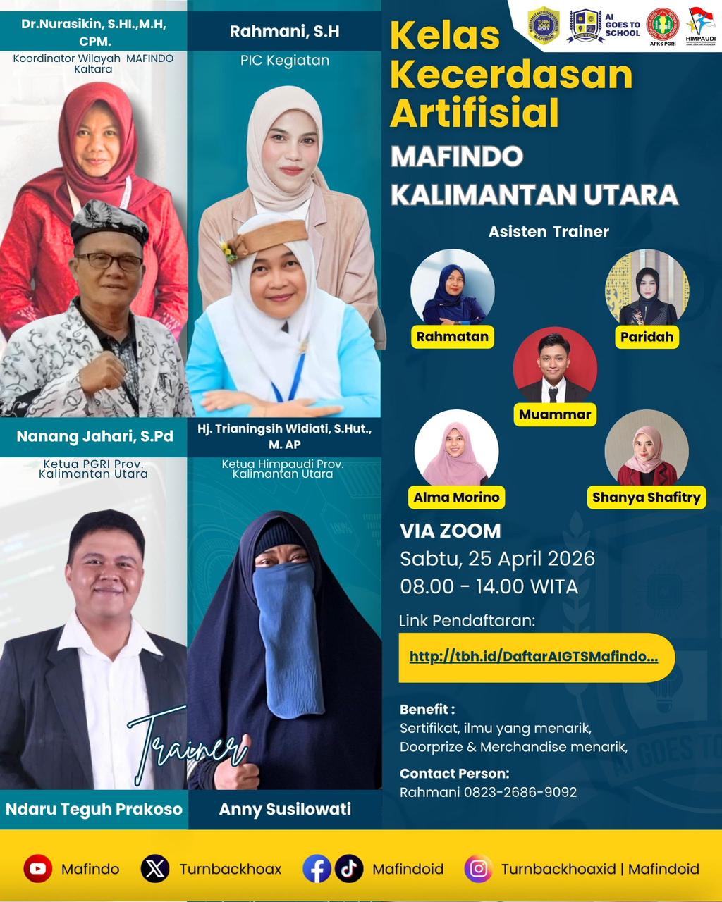 Kelas “AI Goes to School” MAFINDO Kalimantan Utara dipandu oleh trainer berpengalaman Anny Susilowati dan Ndaru Teguh Prakoso, dengan dukungan tim asisten trainer Rahmatan, Alma Morino, Paridah, Muammar, dan Shanya Shafitry. Seluruh kegiatan berlangsung di bawah koordinasi Koordinator Wilayah MAFINDO Kalimantan Utara, Dr. Nurasikin, S.HI., M.H., CPM.